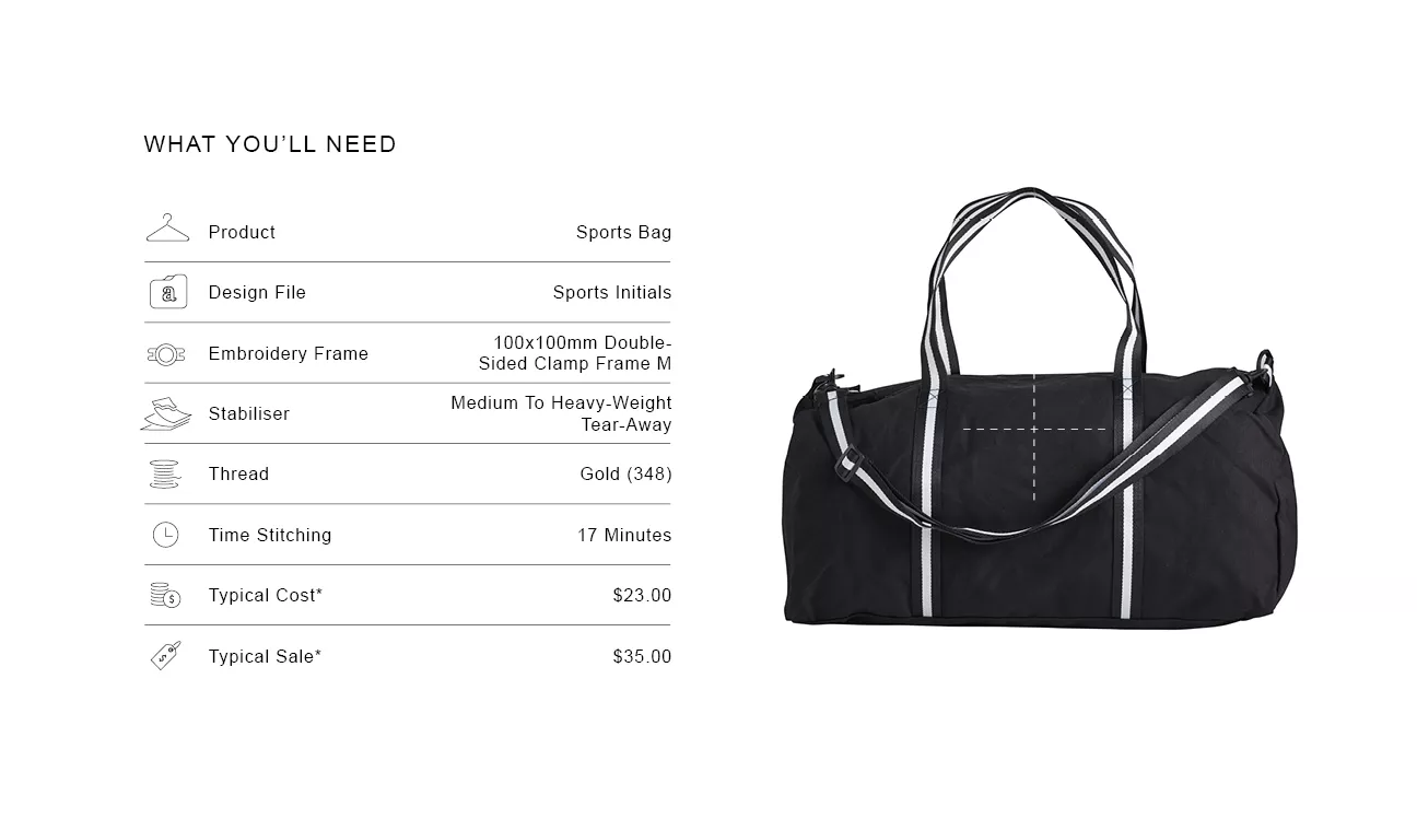 Here we stitch a duffle bag but many bags will suit personalisation, simply adjust initials to suit. Watch out for bags with an internal pocket that may become stitched closed if it will not slide easily over the free-arm