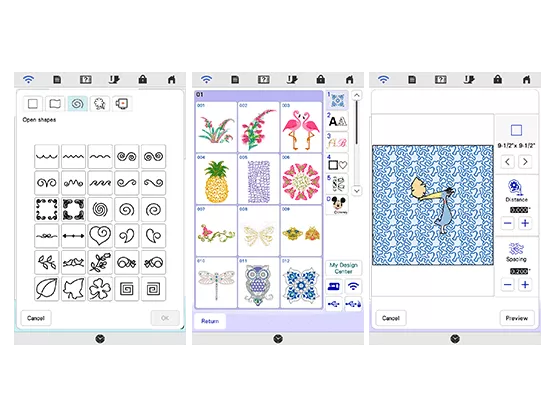 My Design Center comes with 60 closed shapes and 30 open shapes and 5 line types that can be used alone or combined to create unique embroidery projects. Use the built-in library of editable shapes to expand your creative possibilities.