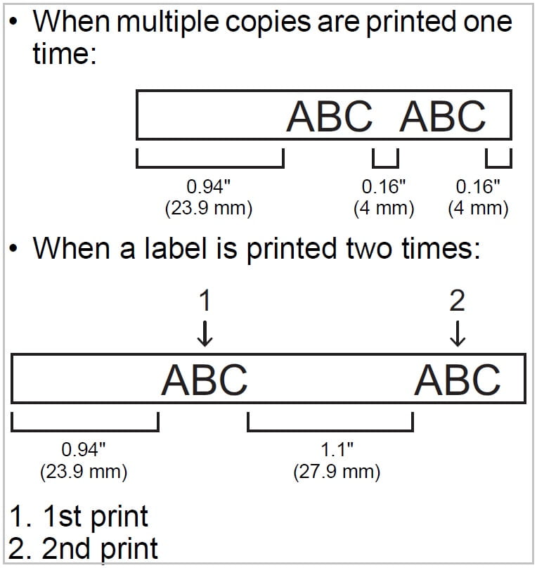 Chain Print reduces tape usage by skipping the automatic cut between each label. Instead, it prints a short 23-25mm lead margin at the beginning, followed by each label with a small 4mm margin on either side of the text.