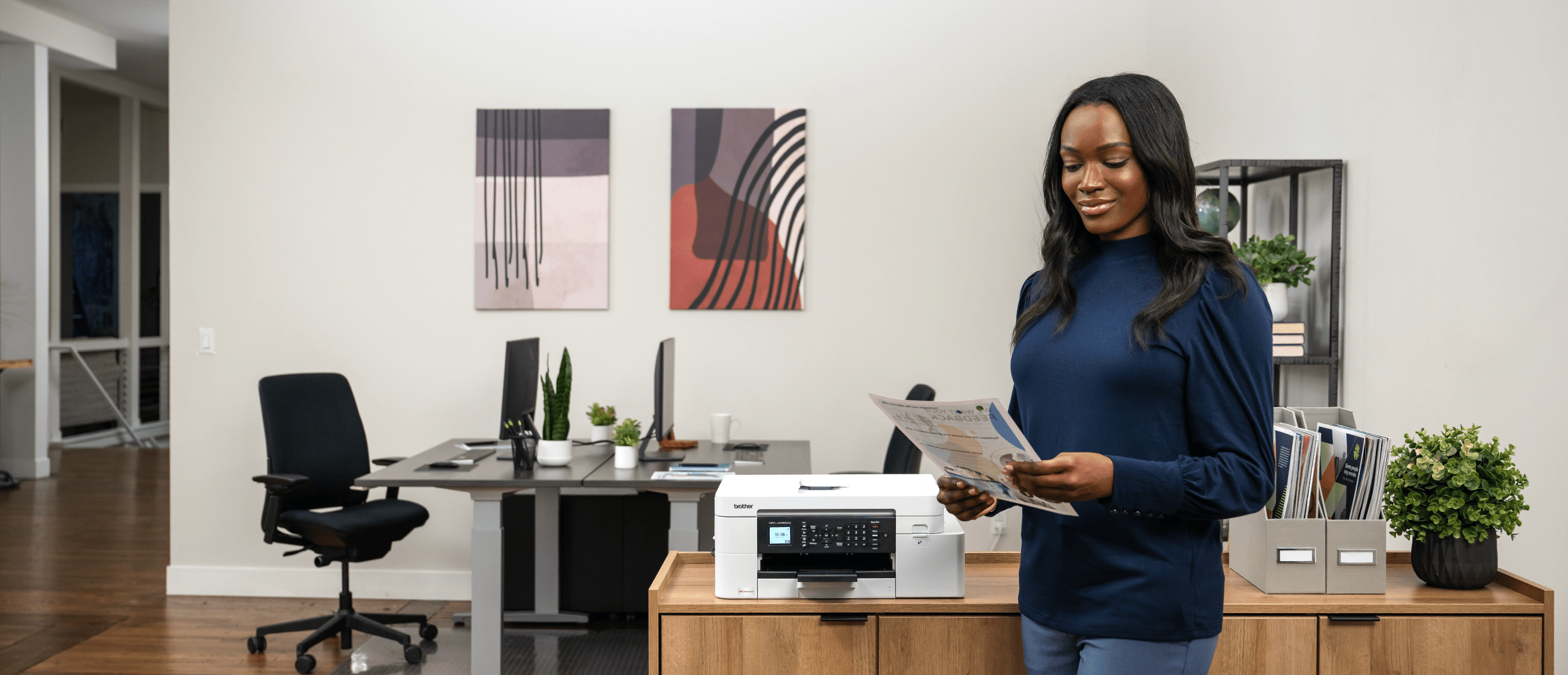 The MFC-J4355DW is designed to keep your space yours, fitting on a bookshelf, sideboard or study nook. With its low-profile, clutter-free design, it stays out of the way until you need it.