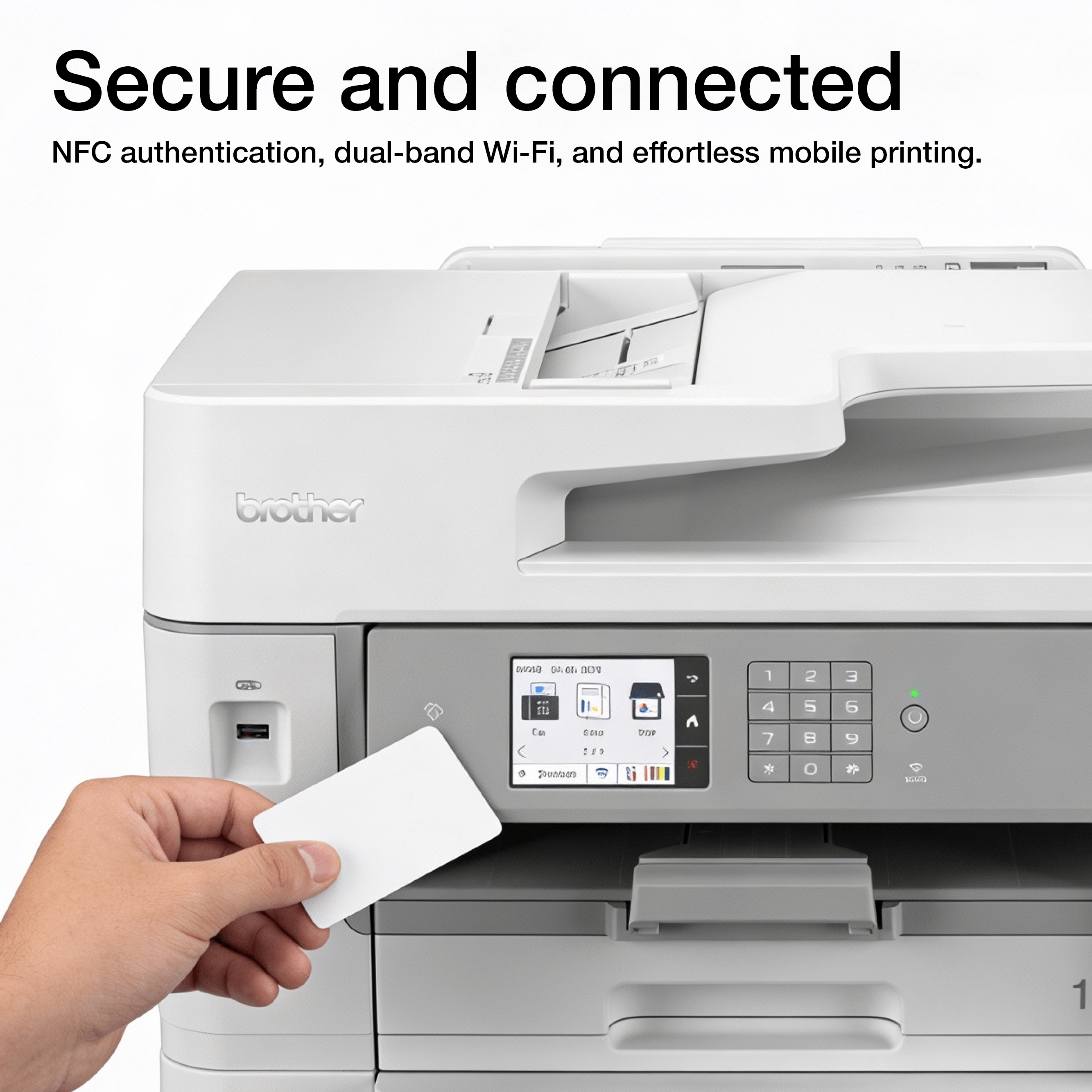 Streamline your day with one-touch workflows on the intuitive 8.8cm touchscreen. Whether in a private office or shared workspace, stay connected effortlessly via NFC, front USB, Dual-band Wi-Fi, or Ethernet.
