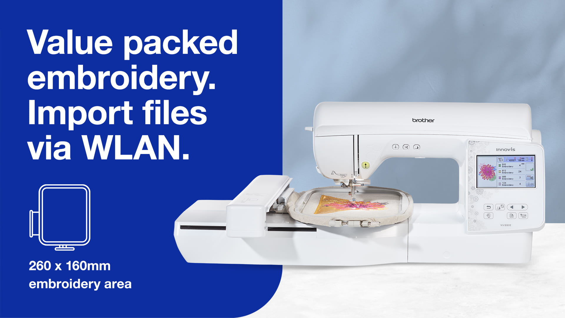 Machine, Embroidery foot U+(with LED pointer) / Embroidery frame & sheet 160 x 260 / Embroidery frame & sheet 150 x 150 / Embroidery frame & sheet 100 x 100 / Embroidery bobbin thread / Embroidery needle set (2 kinds/total 4 needles) / Accessory bag / Pow