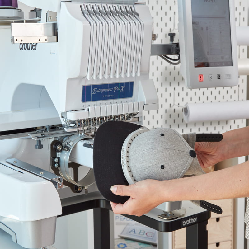 The tubular arm makes it easy to embroider shirts, tote bags, pockets, caps and shoes. (Requires optional Cap Frame and other specialty Frames)