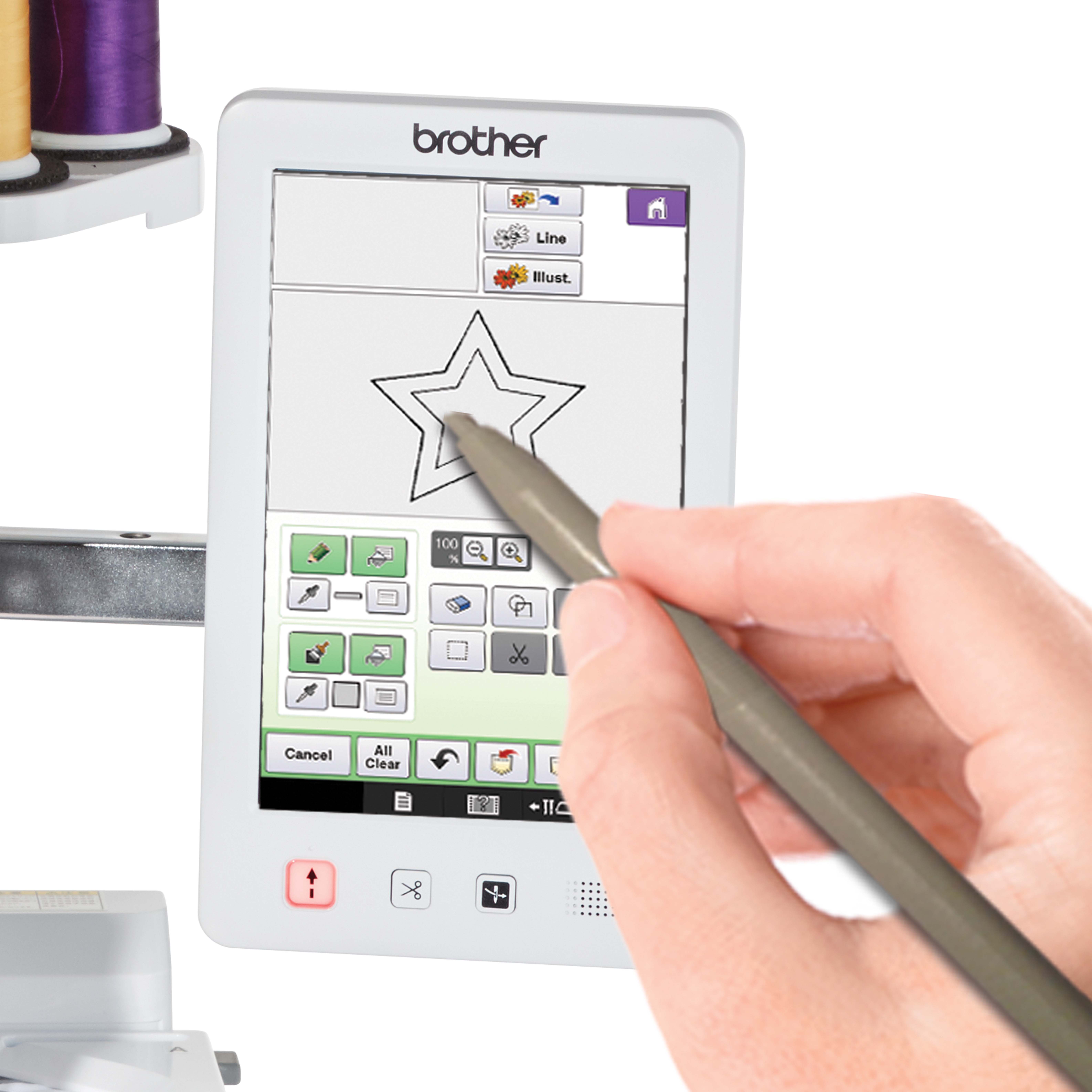 Draw designs directly onto the screen or use the included scanning frame to scan artwork and digitise into stitches without a computer. Powerful 1600% zoom