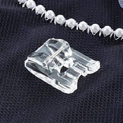 Great for adding a little glitz with sequins or pearls as well as couching larger cords. Place embellishment choice under the foot and into guide to stitch down to the base fabric. Best for beads with a diameter of up to 4mm using a zigzag stitch.