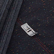 Used for finishing seams by topstitching seam allowances of thick materials (like wool, denim or tweed) folded over to one side. Three position markings help to easily find where to drop the needle and the longer curved shape can hold cloth for better feeding avoiding getting stuck to cloth.